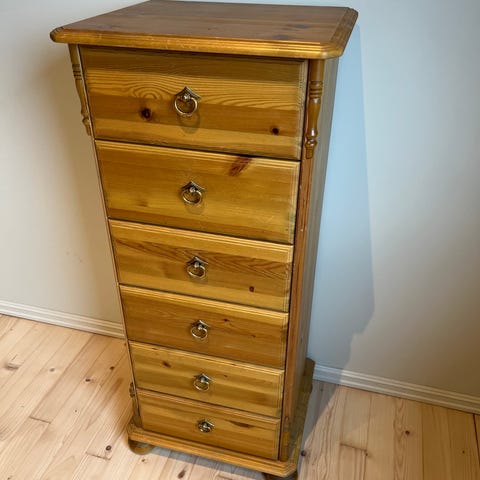 Pent brukt kommode. Alle deler er hele og inntakte. Ingen løse deler. Praktisk smal kommode. Høyde 98 cm, bredde 40 cm, dybde 39 cm.