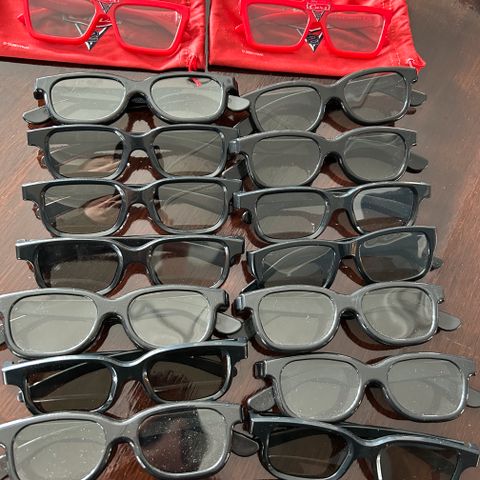 3D-briller med sort innfatning. De er brukt bare én gang (til 3D-film på kino). og kan sendes. Kr.50 pr.stk.