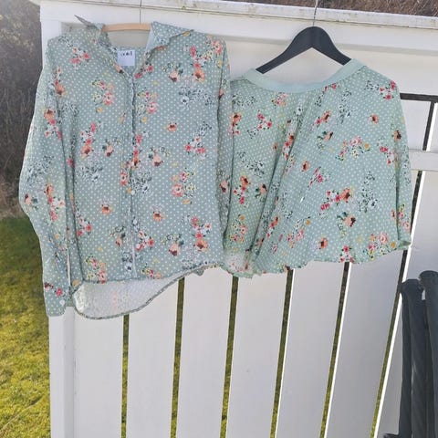 Pen skjorte fra Promod. Skotskrutet mønster. Dypgrønn. Blonder øverst ved kragen og øverst på ermene. Behagelig stoff (viskose og bomull). Noe tykkere stofflag og er god på kjølige dager. Avlang og dekker hoftene.