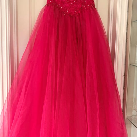 Pent brukt ballkjole/ selskapskjole fra by Kris of Norway i fargen Melon (rosa). Nydelig perlebroderier i bryst- og ryggparti. Skjørtdelen har 3 lag stoff. Kjolen lukkes bak med glidelås i skjørtet og knapper i ryggen. Passer fint til deg som er rundt 160-165 cm høy. Kjolen er størrelse 38, men kan fint brukes av deg som er størrelse 36-38.