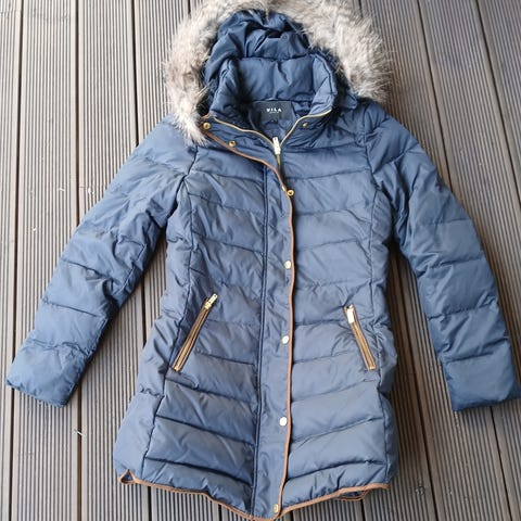 Selger denne gode og varme jakken med 50% dun, av merket Vila. Den har en stor fin hette med fuskepels. Den er veldig lite brukt da den ble litt liten til meg.