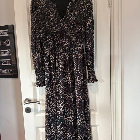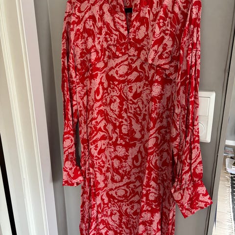 Fin og tidløs omslagskjole fra Second Female. Volanger rundt hals og nederst på skjørtet som er utsvingt. Påsydd underskjørt som er kortere enn selve kjolen. Den er lengre bak enn foran, skrådd .Brukt et par ganger. Som ny.