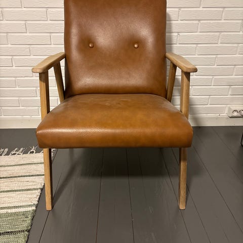 Lenestoler fra 70 tallet, norsk design. De er trukket om og lakkert rustrøde hos proff maler. En høy stol og en lav. Lette å flytte på og gode å sitte i. Kr. 250,-pr stykk
