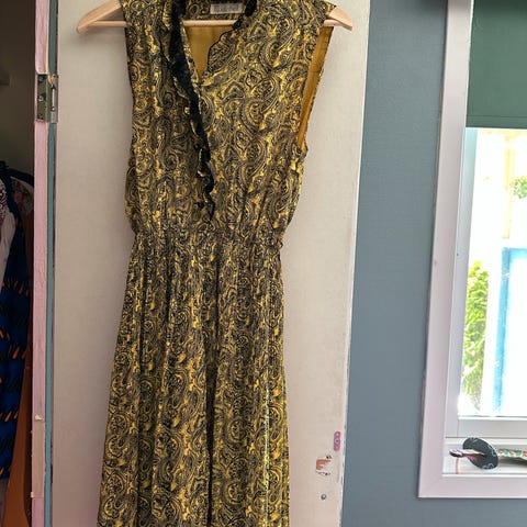 Selger en flerfarget kjole fra MosMosh, kun brukt en gang. Vasket før salg. Det står ikke størrelse men den vil passe en small/medium. Den kan også steames slik at den er glatt når du bruker den.