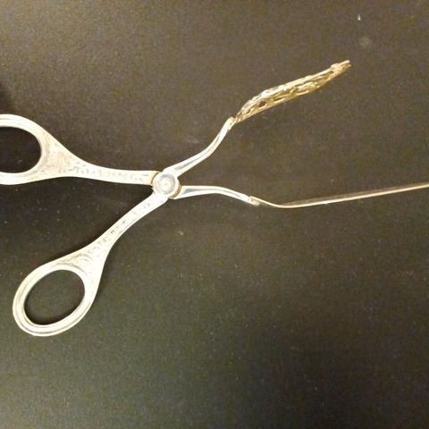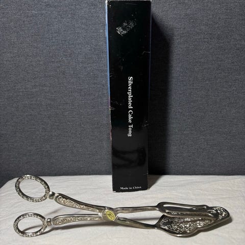 Smørbrødklype / Kakeklype med sølvplett. Passer fint til f.eks. afternoon tea. Sannsynligvis kjøpt på 80-tallet. Jeg har to stykker. til salgs. Den ene er i perfekt stand, og den andre er i god stand med noen veldig små riper på den ene siden. Original eske følger med den ene klypen.