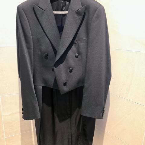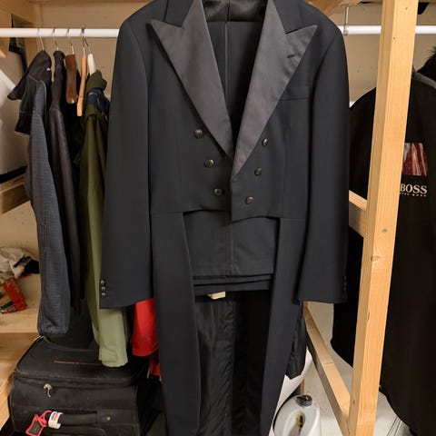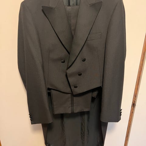 Fin livkjole selges uten skjorte, men med sløyfe og vest. Størrelse 52 på bukse og jakke. Mangler en knapp. Kan leveres mot et tillegg.