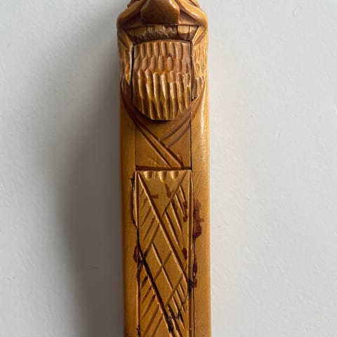 Skjeen måler ca 12,5 cm. Det er en rød stein nedfelt i skjeen. Den er tung.