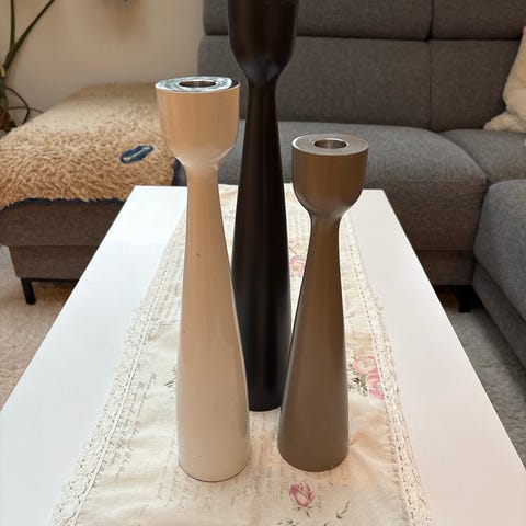 Kan brukes til kubbelys, voksglass eller telys, da det følger med et "telys-tre" og pidestall til ha voksglass på.