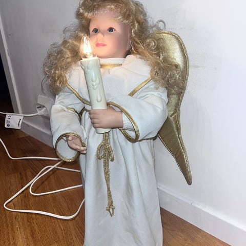 Veldig fin Lucia Engel. Høyde 41 cm og bredde ca 19 cm. Sett i 2 stk. mini/babybatteri og engelen beveger hendene rolig og det lyser i lyset( følger ikke med). Husk å ta ut batteriene ved lagring så de ikke eirer.
