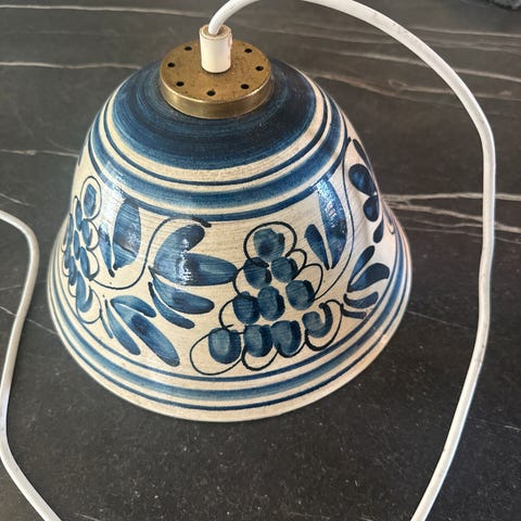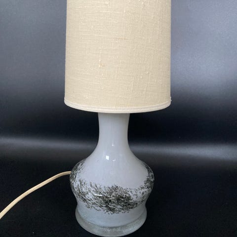 Nydelig lampeskjerm i tykt glass og blyinnfatning av kunstneren Ky Harsheim. Veldig vakkert dekorert glass som gir et flott lysskinn når skjermen monteres på en lyskilde. Skjermen er 31 cm høy og 19 x 19 cm i grunnflate.