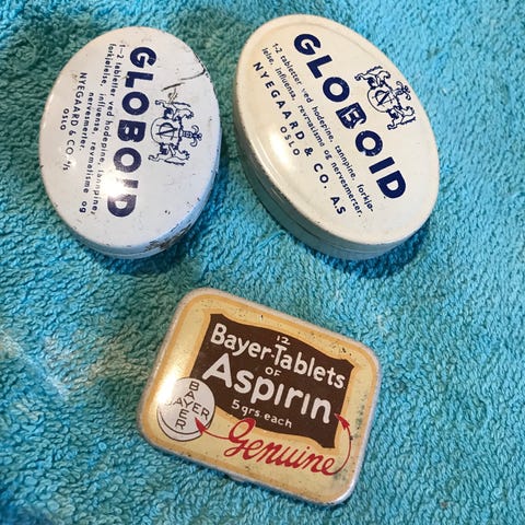 To små bokser i metall. Magnecyltabletter fra Apoteket Ørnen i Bengtsfors (Sverige) og Borvaselin. Den runde har en diameter på 4,5 cm. Den andre er 5 x 7,5 cm. Begge selges samlet for kr 250.
