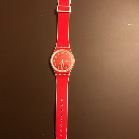 Jeg vet ikke om bildet viser men den er i en skarp rosa farge. Gule tallstreker og visere.