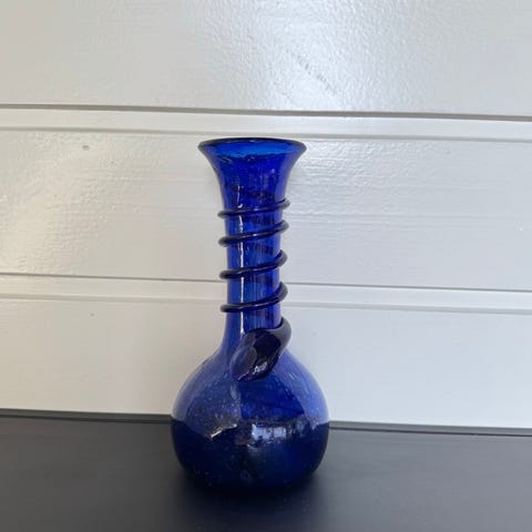 Støvelvasen er koboltblå med noen striper og hank i klart glass. Den er 17,5 cm høy og veier hele 620 g.