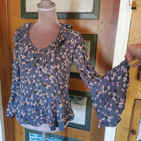 Blå bluse med print fra by timo, finner ikke str men den er liten
