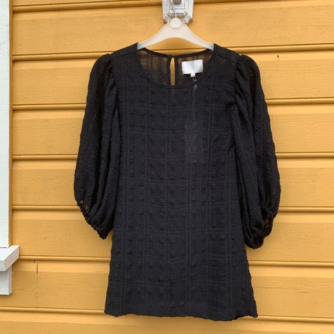 Den er en bluse i luftig, crêpet vevd kvalitet. Liten, volangkantet krage med smale knytebånd og V-formet åpning foran. Lange, raglanskårne, voluminøse ballongermer med smal, trukket elastikk ved mansjettene. Ufôret.