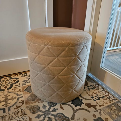 Puffen er lett og mulig å klappe sammen. Den har også en hul boks innvendig som kan brukes til å lagre ting i.