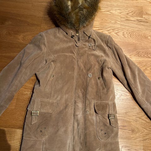 Tøff skinnjakke i semsket sort skinn. Varmt for på innsiden. Str Large.