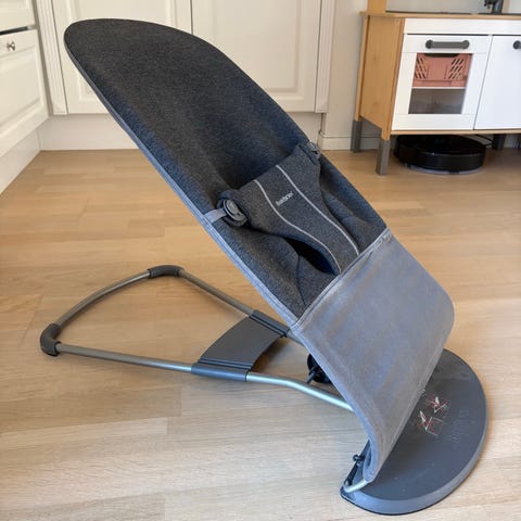 Selger Babybjörn vippestol i grå farge i 3D jersey med myke venner. Nypris for disse er ca. 3000 kr (vippestol i dette stoffet 2499 og myke venner 499). Stoffet har nuppet seg litt på innsiden av beltet, en liten merknad på stoffet øverst på stolen (se bilde)