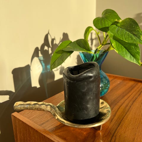 Fin lysestake til kubbelys, jeg tror denne er noen år gammel. I fin stand med litt rester etter stearin og noen riper. 6 cm høy, basen til kubbelyset er 10 cm i diameter. Lyset festes på spissen.