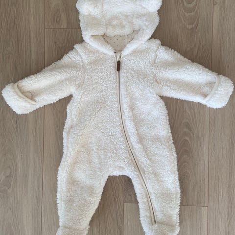 Deilig og myk hvit teddydress med votter i størrelse 68 / 6 mnd. Hel fot, hette med søte ører på. Glidelås og knapper på front.