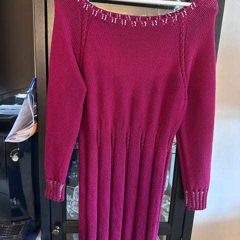 Maskinstrikket ullkjole laget av min mamma. Garnkvalitet: Rauma finull. Rustrød hovedfarge med lilla biser. Glattstrikkede ermer. Fuskepels i hals utringningen. Lang modell. Str M/L