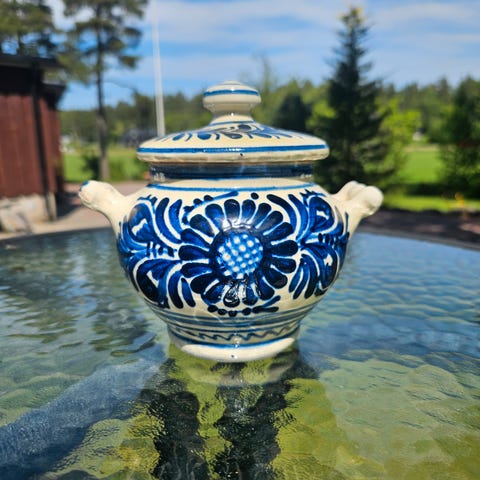 Dekoren er håndmalt, og mindre variasjoner forekommer. Et dekorativt samleobjekt eller blikkfang i interiøret. Hel og pen, uten sprekker.