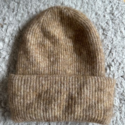 Ubrukt, uønsket mørk grå ribbestrikket lue og skjerf uten tilgode lapp fra Hennes & Mauritz.
