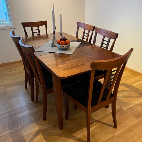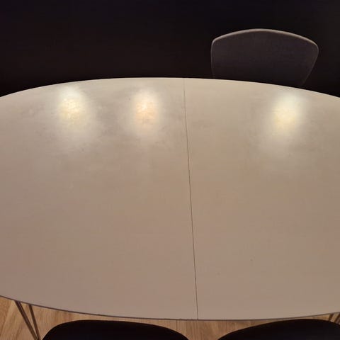 Hvit oval kjøkkenbord som har plass til seks personer, med metallben. To ekstra plater. (48 X 105) følger med for ekstra sitteplasser. En liten flis på toppen. Solid, godt konstruert og stillig.