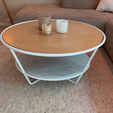 Er blitt lakkert om, da det er 4 små hakk i bordplaten. Lite synlige.
