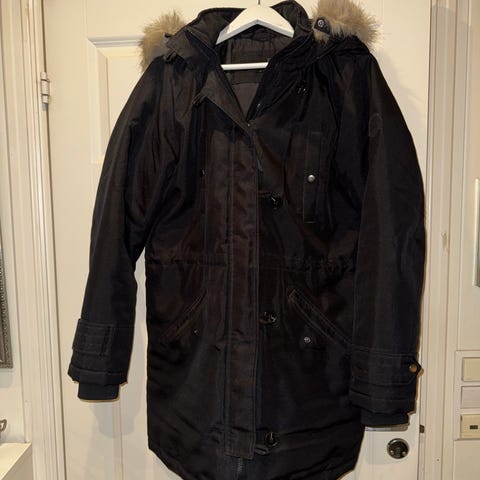 Kåpen har dessverre en slitasje i stoffet rundt en trykknapp under kragen. Dette er ikke synlig og påvirker ikke plaggets funksjonalitet. Slitasjen skyldes at stoffet er tynt og trykknappen er hard å åpne.