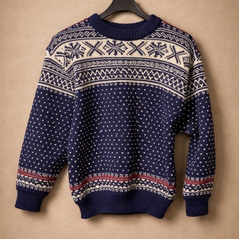 Hjemmestrikket, ikke helt sikker på størrelsen da det var en gave, men passer fra 6-7 år ca.