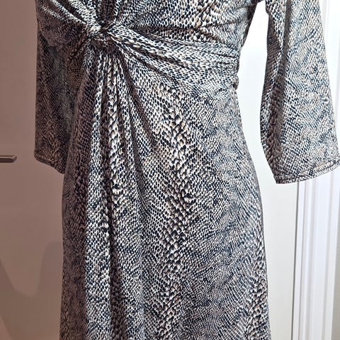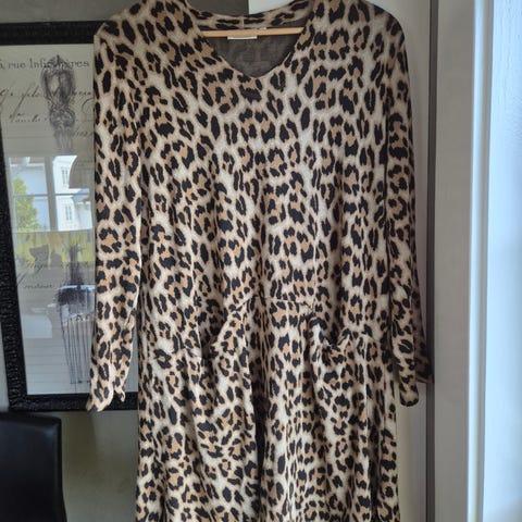 Superbehagelig kjole kjøpt for et par år tilbake som dessverre ikke blir nok brukt. 100% viskose. Det står størrelse 36 på lappen men vil si den er mer som en 38.
