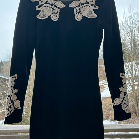 Dyp, firkantet halsringning med rynker foran og bak. Lange, raglanskårne og voluminøse puffermer med smal elastikk nederst. Lett utsvingt skjørt. Ufôret. Meget pen.