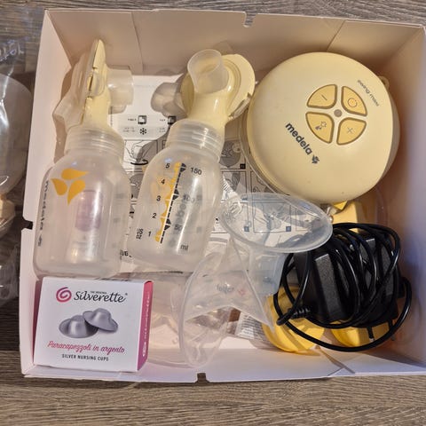 Selges som pakke. Inneholder: Medela Swing Maxi dobbel brystpumpe, 25 stk Medela oppbevaringsposer til brystmelk (uåpnet), 2 stk ammeinnlegg fra Rema 1000 (uåpnet), 2 ammeinnlegg i ull (strl L), 2 ulike brystskjold i strl 20 og 24.