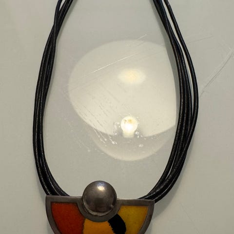 Smykke fra den norske smykkedesigneren Embla. Dette er en av de tidlige kolleksjonene til Embla. Alle Emblas smykker er håndlagde på smykkeverkstedet deres i Risør. Anheng og lås er stemplet 925, samt Elmblas eldre logo. Anhenget henger i trippel skinn-snor. I god stand, men trenger en sølvpuss om man ikke ønsker patina.
