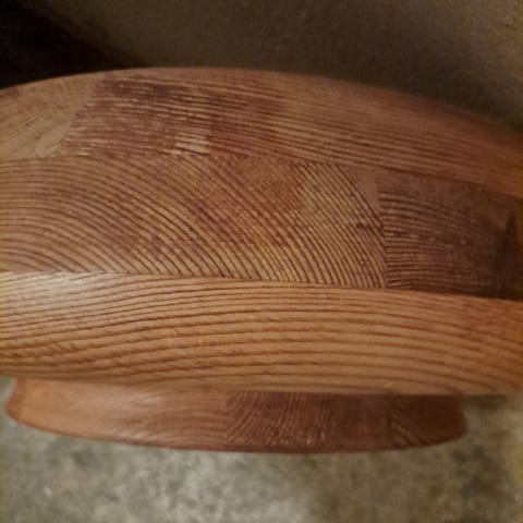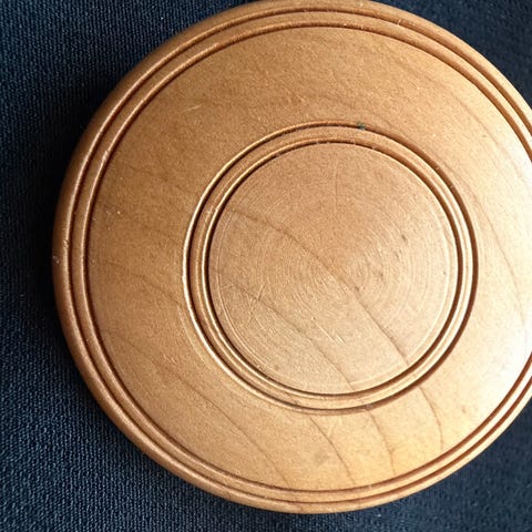 Dreid trelokk.Yttre diameter 24,7 cm Høyde 2 cm ( uten hank) Innerste diameter 21 cm..