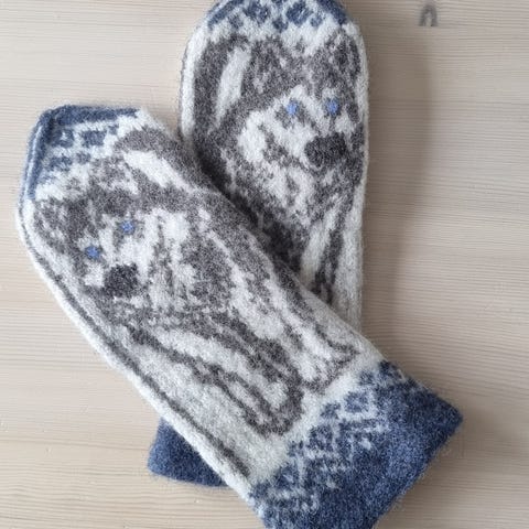 Vottene har et reinsdyr i måneskinn og masse grantrær. Grunnfargen er mørk blå og mønster i hvitt pg gult. De er vasket på 40 grader og er lett tovede.