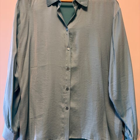 Det er V-ringet bluse i vevd kvalitet med glans. Krage, knapper foran, og lange ermer med erme splitt, mansjett og knapping. Avrundet kant nederst. Lys tåkegrønn farge.