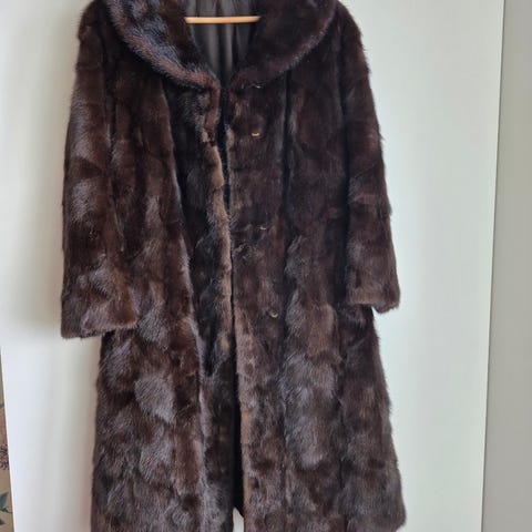 Tilstand: Meget pent brukt, oppbevart hengende innendørs. Veldig blank, og myk.