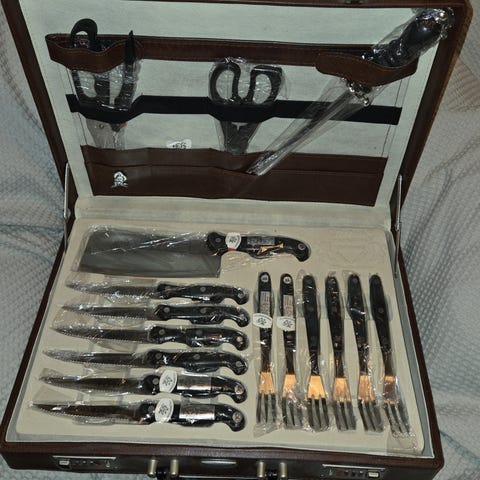 Nytt og ubrukt biff- og knivsett fra det anerkjente merket Solingen. Settet består av totalt 20 deler og leveres i en praktisk koffert for oppbevaring. Kofferten har kodelås og er solid. Solingen er kjent for sin høye kvalitet og slitestyrke, noe som gjør dette settet perfekt for både hverdagsbruk og spesielle anledninger. Det mangler 4 deler i settet, noe som er hensyntatt i prisen. Dette er likevel et komplett sett for de fleste behov, inkludert biffkniver, gafler og flere allsidige kniver. Se bilder for dimensjoner.