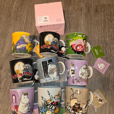 Samling med ulike mummikrus. Meget pent brukt. Se flere bilder for oversikt og navn på koppene. Samling selger høystbydende. Minstepris samlet 6000.