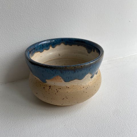 2 Nydelig håndlaget stort krus / vase, blå spettet