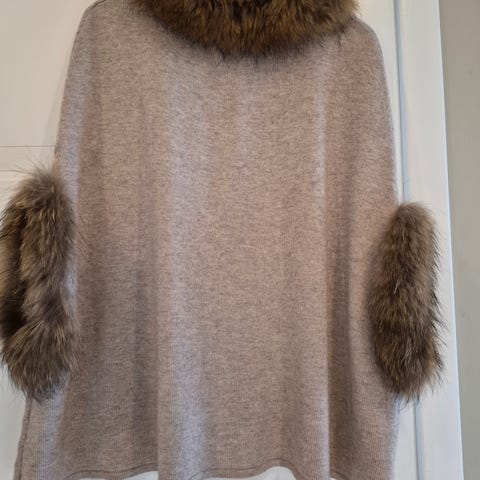 Superfin poncho fra Carla F i grå, m pels detaljer på armene. Glidelås i halsen på siden, Fin utenpå kjoler på vei til og fra fest.