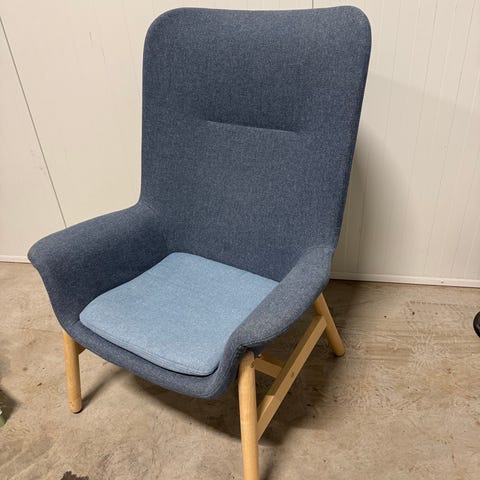 2 stk pent brukt blåLandskrona lenestoler og 1 puff fra IKEA.
