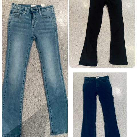 En jeans fra Wow, str. 146, Skye high waist slim fit og en sort slengebukse (stretch) fra H&M, selges samlet for 150 kr.