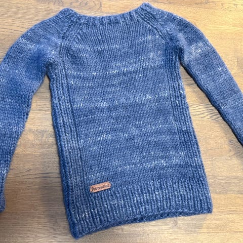 Genseren er strikket i Alpaca Bris. Den er tykk og varm. Den ligger i målene mellom 6-8 år. Den er strikket i et røykfritt miljø. Kan sendes. Da kommer porto på 76kr i tillegg