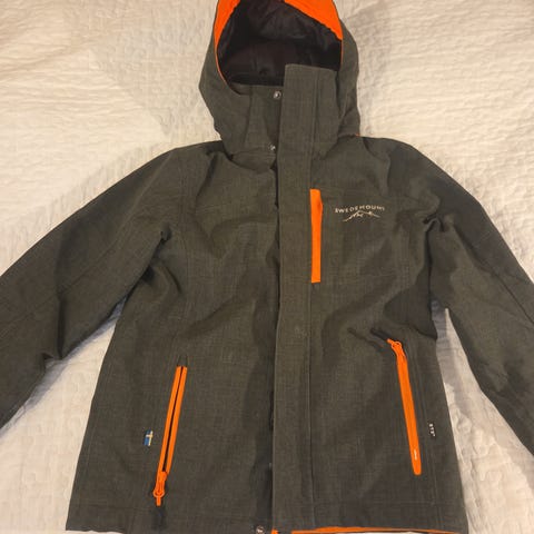 Fin Spyder skijakke i god kvalitet og god stand. Str 140 farge blå med mørkeblå og gule detaljer.