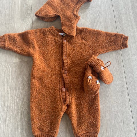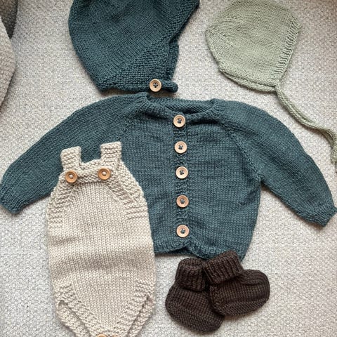 Alt er hjemmestrikket i merinoull og helt nytt/uåpnet. Selges samlet.