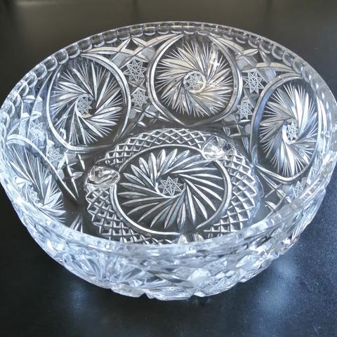 Selger en stor og vid krystallbolle med et dekorativt mønster for kr 250,-.