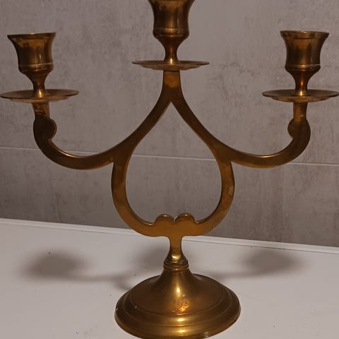 Messinglysestake selges for 220 kroner (høyde 26 cm / bredde 21 cm). K28. Fraktkostnader: PostNord - 69 kroner. Betaling via vipps.